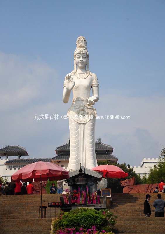 在云南福星廣場的正中矗立著一尊高達17.56米的漢白玉觀音雕像。該像共由269塊漢白玉構成,重約400噸,具有“端莊、肅穆、神奇、美慧”等造型藝術特征。觀音像的兩臺基座(蓮花座和須彌座)分別高2米和1.2米,觀音像高14.36米,系目前世界上最高的一尊漢白玉觀音雕像。