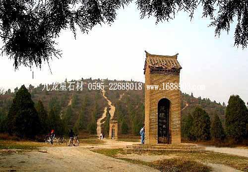 乾陵是唐朝第三代皇帝李治和女皇武則天的合葬陵,位于陜西省乾縣城北6公里的梁山上,距西安80公里。東有豹谷,西有漢谷,依山為闕,氣勢雄偉。這是唐十八陵中最有代表性和迄今保存最好的一座陵墓。陵園內城的南北城墻各長1450米,東墻長1582米,西墻長1438米,墻體厚2.4米。乾陵的地面設置,遺留到現在的主要是陵墓石刻。這些石刻十分精美,屹立在梁山之巔,至今已有1200多年的歷史。另還有朱雀門外兩座大碑,即“七節碑”和著名的“無字碑”,以及石像61尊。圖片: