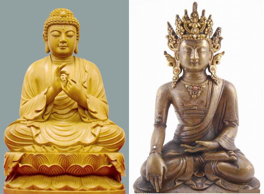 這些佛沒有太多的固定標幟,阿彌陀佛一般是雙手重疊置膝上作禪定手印;毗盧遮那佛雙拳握抱,兩手食指相并,稱智拳印;藥師佛右手往往捻一藥丸或左手托一小缽;其他的佛作說法印或作施無畏印。按佛經上說,只有降魔印、說法印、禪定印、施無畏印、與愿印等五種基本手印,各佛皆可使用。
