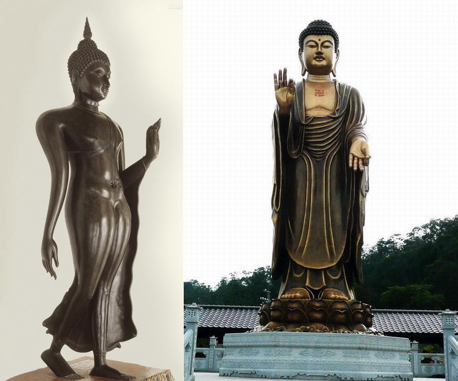 佛立像本于釋迦佛游行說法的姿勢。相傳釋迦成道后,在西北印度各地游行說法四十九年。所以佛的立像多為一腳向側前略伸,表示步行的樣子,一般稱之為行徑像。還有一種雙腳并立于蓮花臺上,雙手作接引狀,這大多是阿彌陀佛像,表示接引往生西方極樂世界的意思。在尊像旁,有一種站立合掌的菩薩或弟子的像,這稱之為侍立像。此外,各種護法天神的像多為立像,其姿勢則有各種各樣。