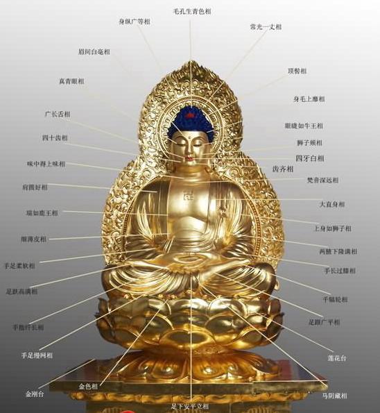 第一. 足下安平立相;第二. 千輻輪相(足底猶似掌紋顯出千輻輪);第三. 長指相;第四. 足跟廣平相;第五. 手足指縵網相(手足之間如蹼狀);第六. 手足柔軟相;第七. 足趺高滿相;第八. 伊泥延膊相(或瑞如鹿王相),即股骨如鹿那樣纖好;第九. 正立手過膝相;第十.馬陰藏相;第十一. 身縱廣相(雙手平舉時,其寬度與身高相等);第十二. 毛上向相;第十三. 一孔一毛生青色相;第十四. 身金色相;第十五. 丈光相(身光照四面各一丈遠);第十六.細薄皮相;第十七. 七處(兩手、兩足、兩肩、脖頸)隆滿相;第十八. 兩腋下隆滿相;第十九. 身如獅子相;第二十. 身端直相;第二十一 肩圓滿相;第二十二.四十齒相(常人四十六個);第二十三. 齒齊相;第二十四.牙白相;第二十五. 獅子頰相;第二十六. 味中得上味相(咽喉中有特別的津液,味覺上好);第二十七. 廣長舌相;第二十八. 梵音深遠相(聲音清澈深遠);第二十九.真青眼相(眼睛紺青色,如澄清的海水一樣);第三. 睫如牛王相;第三十一. 頂髻相(頭頂有肉隆起如譬,非常飽滿);第三十二. 白毛相(眉間有白毛,也稱眉間白毫相,平時卷縮,伸開達一丈五,從這里放出的光叫毫光、眉間光。白毛清凈柔軟,如兜羅綿,右旋宛轉,常放光明也。)