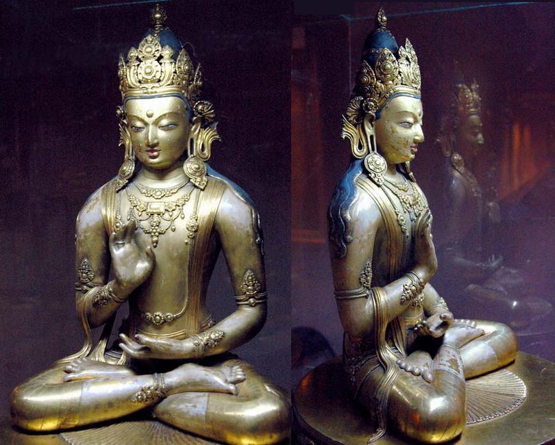 元代統治階級信奉藏傳佛教,但對其它宗教信仰采取寬容態度,因而傳統的佛教藝術仍得到繼承和發展。同時,藏傳佛教密宗,與傳統佛教顯宗并存,使佛教造像亦有增益。“漢式造像 ”繼承了唐宋傳統風格,漢化佛教特征更加明顯;“梵式造像”受到印度巴拉王朝作風的影響,有其特定的儀軌,雖與“漢式造像”有些共同點,但從外表形象到內在的精神狀態,從面型、體型、姿態、服飾、執物,到背光、蓮座乃至龕形,大多顯露出梵式藏傳佛教造像的特征。到了明代,東傳的“梵式”已與“漢式”融合一起,佛教造像進一步漢化。清代,“梵式造像”與“漢式造像”并存不悖,各領風騷。特別是一些鎏金銅造像,制作精美,光彩奪目,有的還鑲嵌珍珠寶石,十分寶貴。
