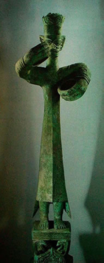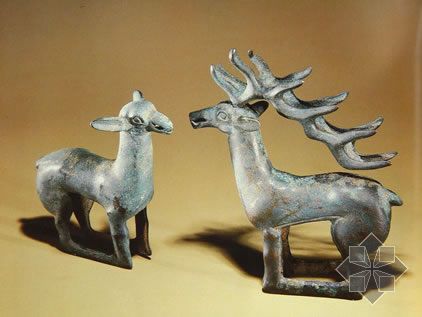 春秋以后的青銅器以人形為支架的逐漸多了起來,重要的代表作品有湖北隨縣曾侯乙墓所出的一組鐘架銅人,還出土蟠龍建鼓座。在河南洛陽金村的東周墓葬中出土有銅、銀、玉等不同材質的人物形象。還有江蘇漣水三里墩所出的銅臥鹿。這些都是戰(zhàn)國時期的作品。
