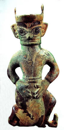 唐代詩人李白 《蜀道難》中曾經慨嘆:「蜀道之難難于上青天!蠶叢及魚鳧,開國何茫然!」蠶叢和魚鳧都是傳說中的古代蜀王。他們活動年代和文化遺跡一直不清。1929年在四川廣漢地區(qū)發(fā)現(xiàn)古蜀人玉石坑,1986年又在廣漢三星堆發(fā)現(xiàn)了兩個祭祀坑。出土金器、青銅器、玉器、陶器、象牙骨器等近千件,還有海貝;由此了解到廣漢一帶在三、四千年以前,曾有高度發(fā)展的文化,正相當于傳說中的古蜀王魚鳧統(tǒng)治時期。