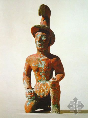 新疆新源縣境鞏乃斯河南岸也出土有寫實的銅人,作蹲跪姿勢。頭戴尖頂寬沿帽,大眼高鼻,有鮮明的民族特征。裸上身,下體著短裙,赤足。兩手分握管狀套筒,與中原地區(qū)所出土的,作為器物支架或底座的人物相近。這件作品準確地塑造出健壯、富有彈性的肌肉,和骨骼與肌肉的解剖關系,再現(xiàn)了當時塞外武士的勇武風范,是同時期雕塑作品中少見的。