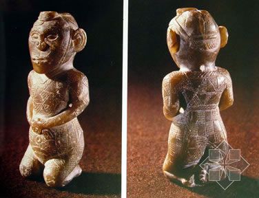 1979年在遼寧咯左旗大城子鎮(zhèn)東山嘴紅山文化(距今5,000多年 )遺址,發(fā)現(xiàn)了兩件小型孕婦像和20多件人像殘塊(左腿疊于右腿盤膝正坐,雙手交叉于腹部)。這里是進行祭祀活動的場所,方形基址是祭奉地母神的祭壇,而圓臺可能是供奉生育神或農神的祭壇。女像的頭部、右臂及膝下已殘缺,體形肥碩的一件表面磨光,著紅彩。