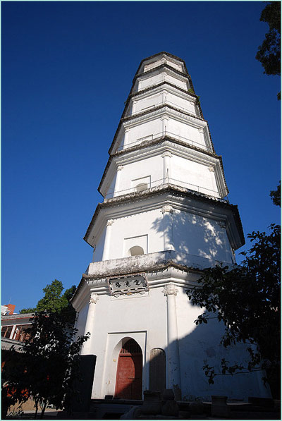 福州白塔又名報恩定光多寶塔,位于福州市鼓樓區南門萬歲寺后。福建省文物保護單位。塔高7層,塔身8面,內以磚砌,外用木構,頂有相輪塔剎,塔壁及門面繪有金佛像。1962年維修時,又在塔的周圍出土青石浮雕塔座15方,在原位豎立,以保存文物并供觀賞。