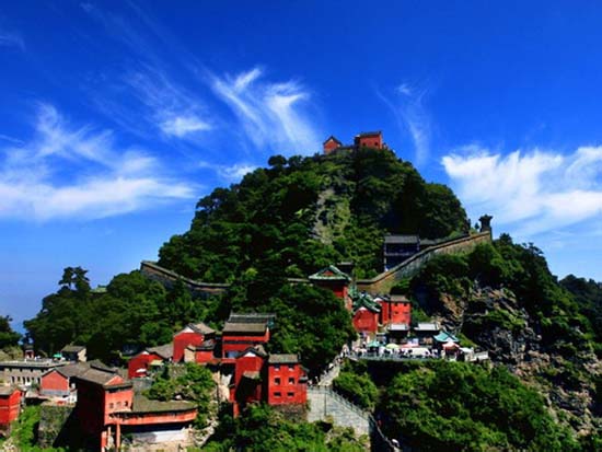 武當(dāng)山又名“太和山”,位于中國中部湖北省丹江口市的西南部。相傳為道教玄武大帝(北方神)修仙得道飛升之勝地, 歷代道教名流曾在此修煉。據(jù)記載, 唐太宗貞觀年間即在靈應(yīng)峰創(chuàng)建五龍祠。宋、元以來, 代有開拓?cái)U(kuò)建。明成祖于永樂十年(1412)曾動(dòng)用軍夫30多萬人在此大興土木?,F(xiàn)存的36處宮觀大多是明代所建, 是中國現(xiàn)存最完整、規(guī)模最大、等級最高的道教古建筑群。宮觀內(nèi)保存的各類神像、法器、經(jīng)籍等都有較高的文物和藝術(shù)價(jià)值。明代(公元1368~1644年)時(shí),武當(dāng)山被皇帝敕封為“大岳”、“玄岳”,地位在“五岳”諸山之上。武當(dāng)主峰天柱峰,海拔1612米,周圍又有“七十二峰”、“三十六巖”、“二十四澗”等勝景環(huán)繞,風(fēng)光旖旎,氣勢宏偉,被世人贊為“萬山來朝”。