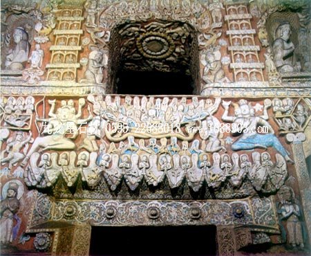 石窟位于山西省大同市西北的武州山北崖上,是我國三大石窟之一,距今已有1500多年的歷史。整個石窟依山開鑿,東西綿延1公里,現(xiàn)存主要洞窟53個,大小造像51000多個。石窟雕刻的題材內(nèi)容,基本上是佛像和佛教故事。石窟中最大的佛像是第五窟三世佛的中央坐像,高達(dá)17米。佛像形態(tài)端莊,是中原文化傳統(tǒng)的表現(xiàn)手法,但其臉部形象:額寬、鼻高、眼大而唇薄,卻具有外域佛教文化的某些特征。