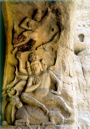 最饒有趣味的是第八窟拱門東側(cè)雕刻的摩醯首羅天和西側(cè)的鴻摩羅天,一個騎神牛三頭八臂,一個乘神鳥五頭六臂。這一組新奇神異的浮雕,不再是生命的寫實(shí),而是精神的寫意。游牧民族用審美的藝術(shù)形象折射生命現(xiàn)象中的“多頭多臂”,內(nèi)化為人類幻想生長出更多的智慧頭腦和勇敢的手臂,去征服自然,以獲得自身生命的拓展與延伸。