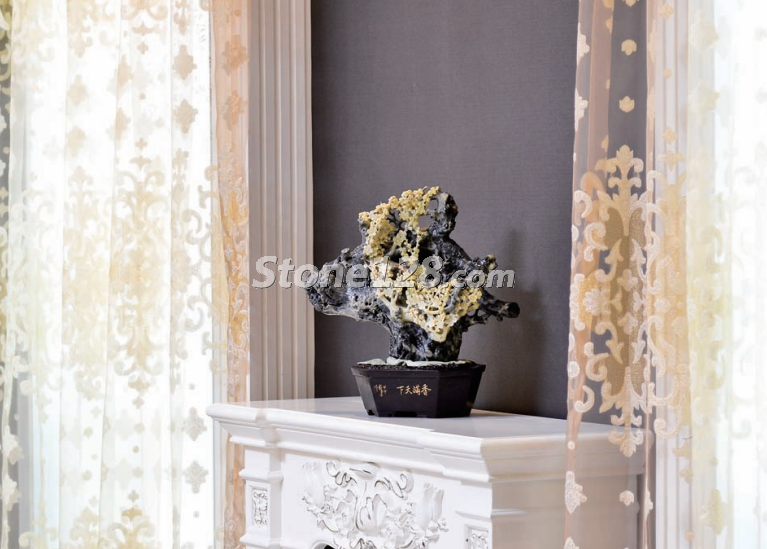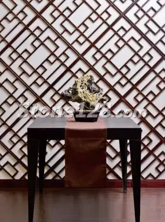 在新中式風格的大廳中,石雕作品的外形與背景窗花的菱形相互協調,取得了很好的諧調效果。石雕的色彩與整體環境的深色調相互統一,臘梅花典雅的黃色又活躍了色彩的意境氛圍。整體空間的直線風格與石雕作品的曲線造型相對比,剛柔相濟,收放有度,取得了很好的視覺效果。