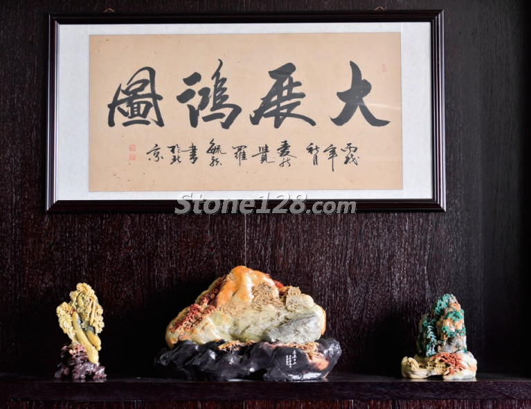 在內室陳列柜上放置石雕作品,暖色的背景與燈光相融合,溫和的造型與豐富的陳列物品相諧調,充分體現了這件石雕作品中溫馨典雅的內涵。