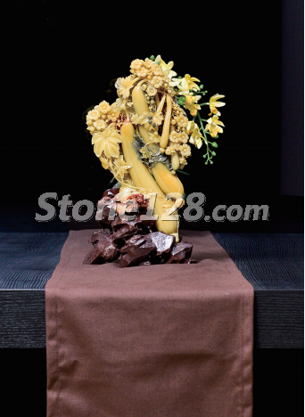 擺放在餐廳,既有美滿和諧的氛圍,又有艱苦奮斗的寓意。作品的曲線造型與餐廳環境的直線造型相互彌補,中和了各自的不足。深色的餐桌及背景很好地襯托了淺色的石雕作品,給整個空間注入了生命力。