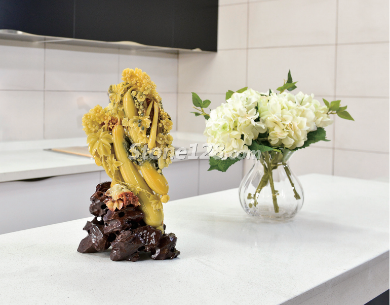 石雕作品的色彩正好豐富了黑白色彩造成的單調感,典雅的造型又很好地舒緩了幾何形空間結構造成的僵硬感,使得整體空間環境舒適溫馨,充滿了生活氣息。